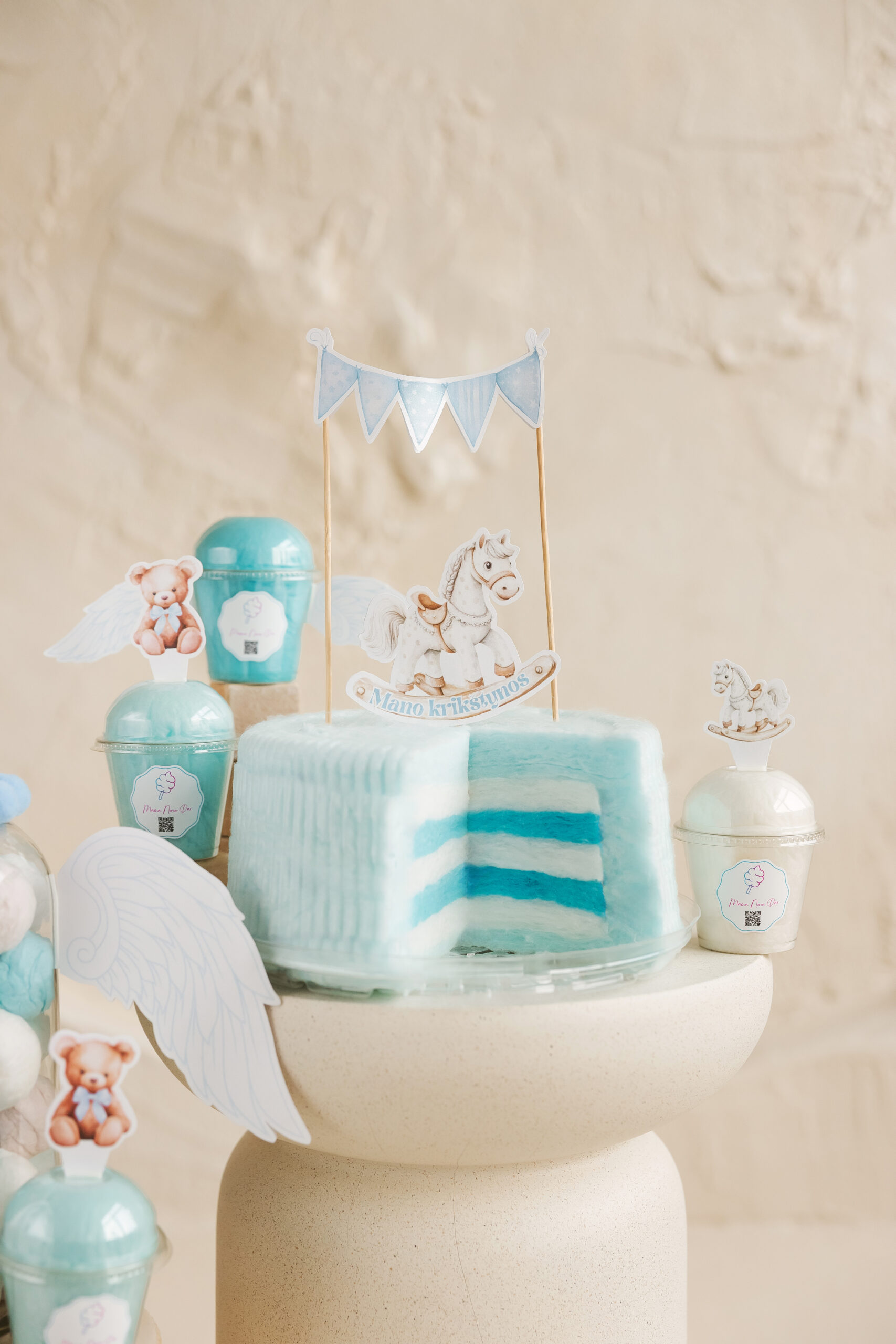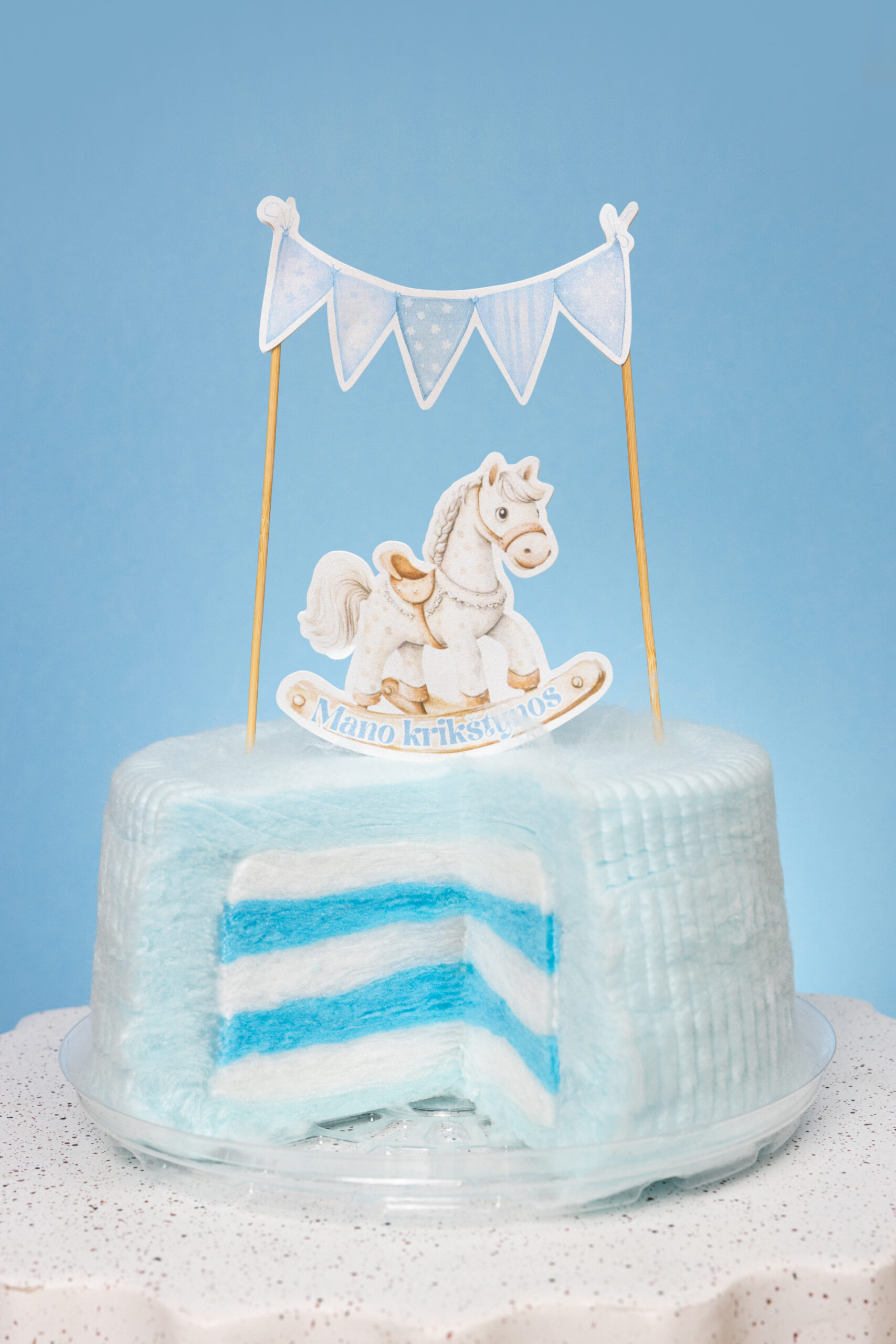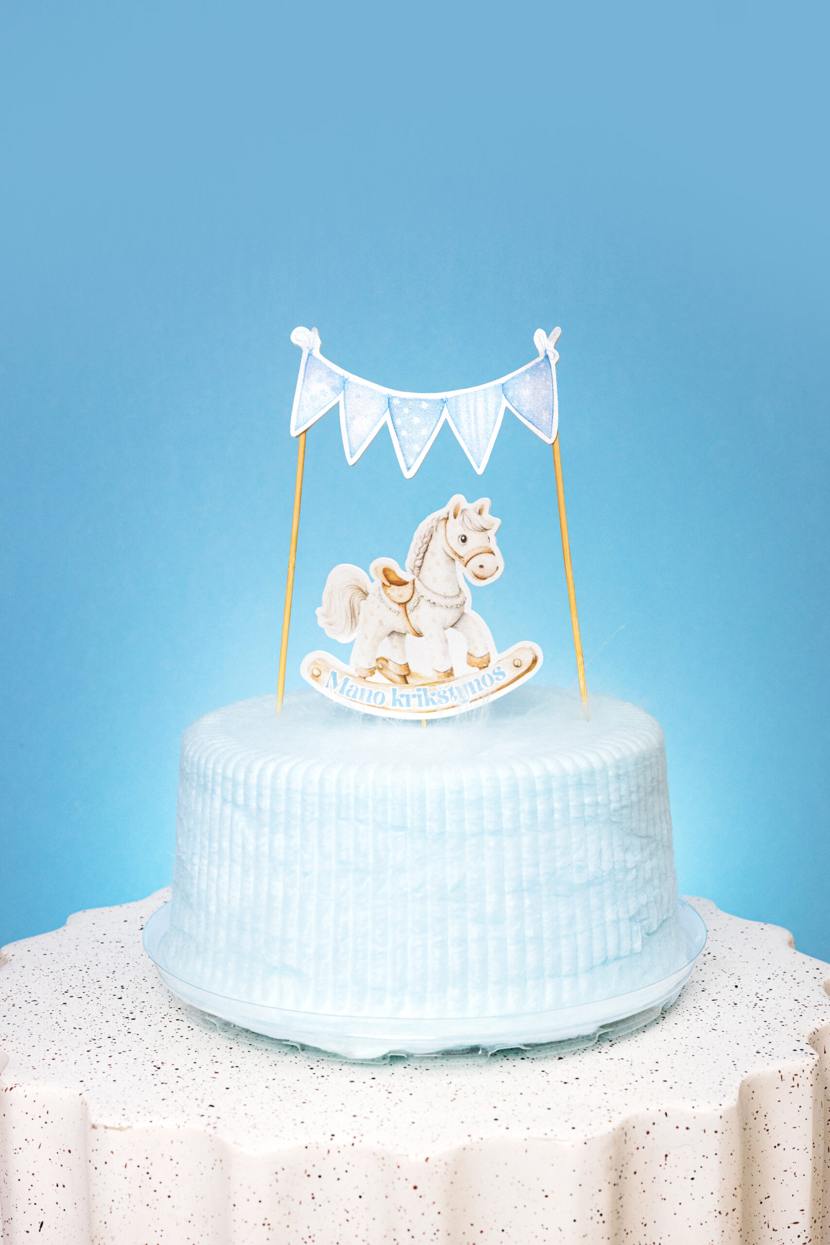 Dekoracijų komplektas su arkliuku įskaičiuotas į kainą ir pridedamas prie torto. Komentare nurodykite, koks vardas turi būti matomas dekoracijose.